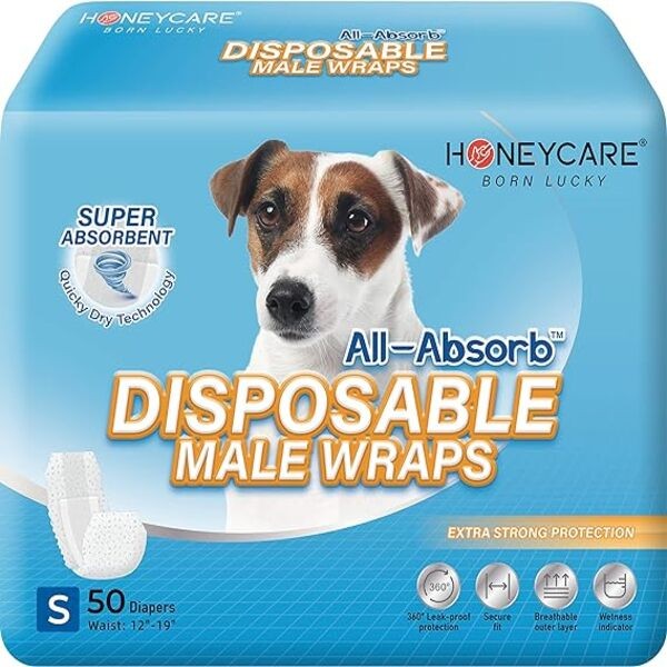 WRAP IT UP- All-Absorb Disposable Male Wraps are designed to fit: -Large-sized male dogs with a 25 - 32 inch waist. -Medium-sized male dogs with a 18 - 25 inch waist. -Small-sized male dogs with a 12 - 18 inch waist. -Extra-Small sized male dogs with a 6 - 13 inch waist. These are guaranteed to keep your little buddy comfy and dry, while helping you maintain peace of mind. RELIEF FOR WHEN HE RELIEVES HIMSELF - All-Absorb Disposable Male Wraps provide much needed protection for male dogs with incontinence, excitable urination, or those who feel compelled to mark things that are clearly not his.